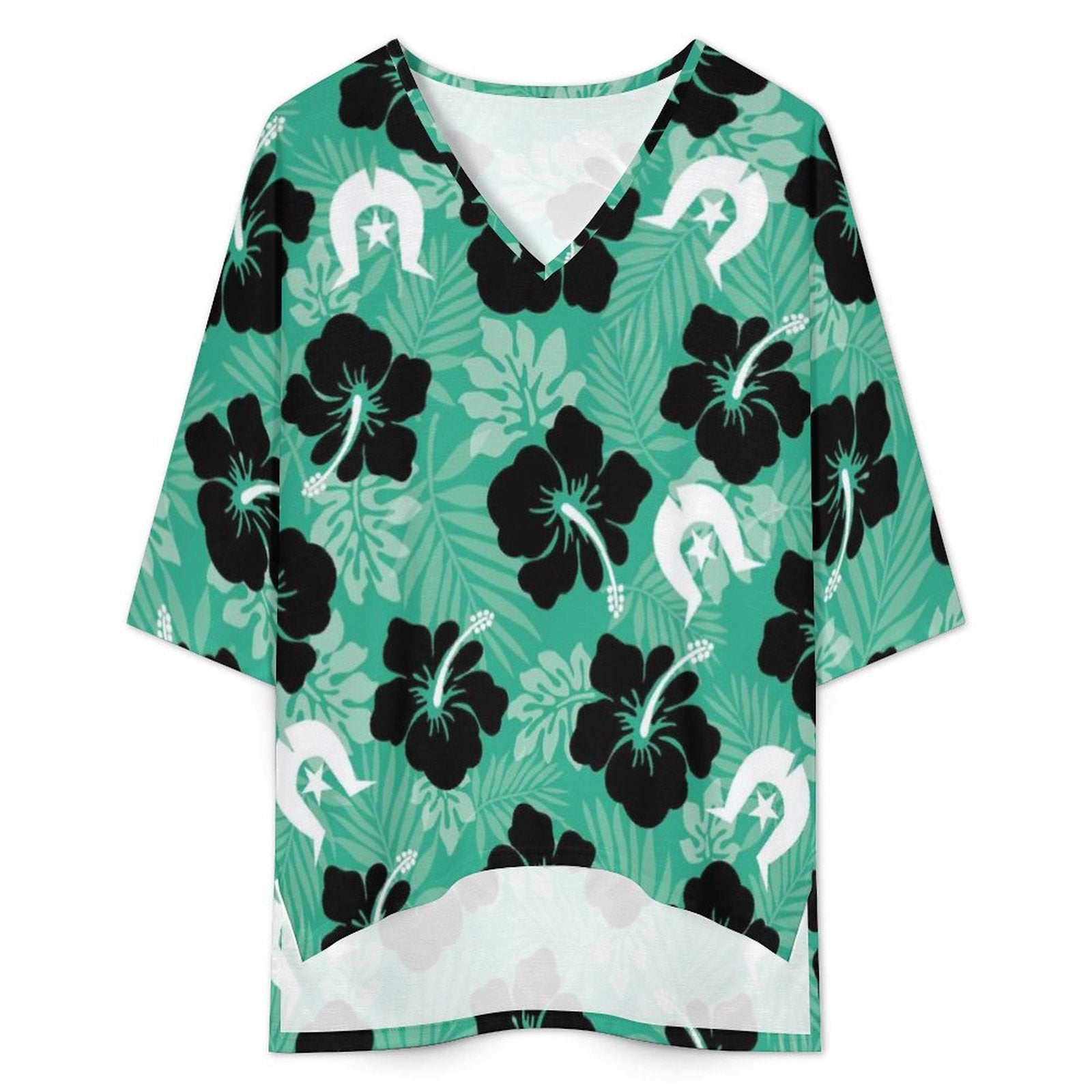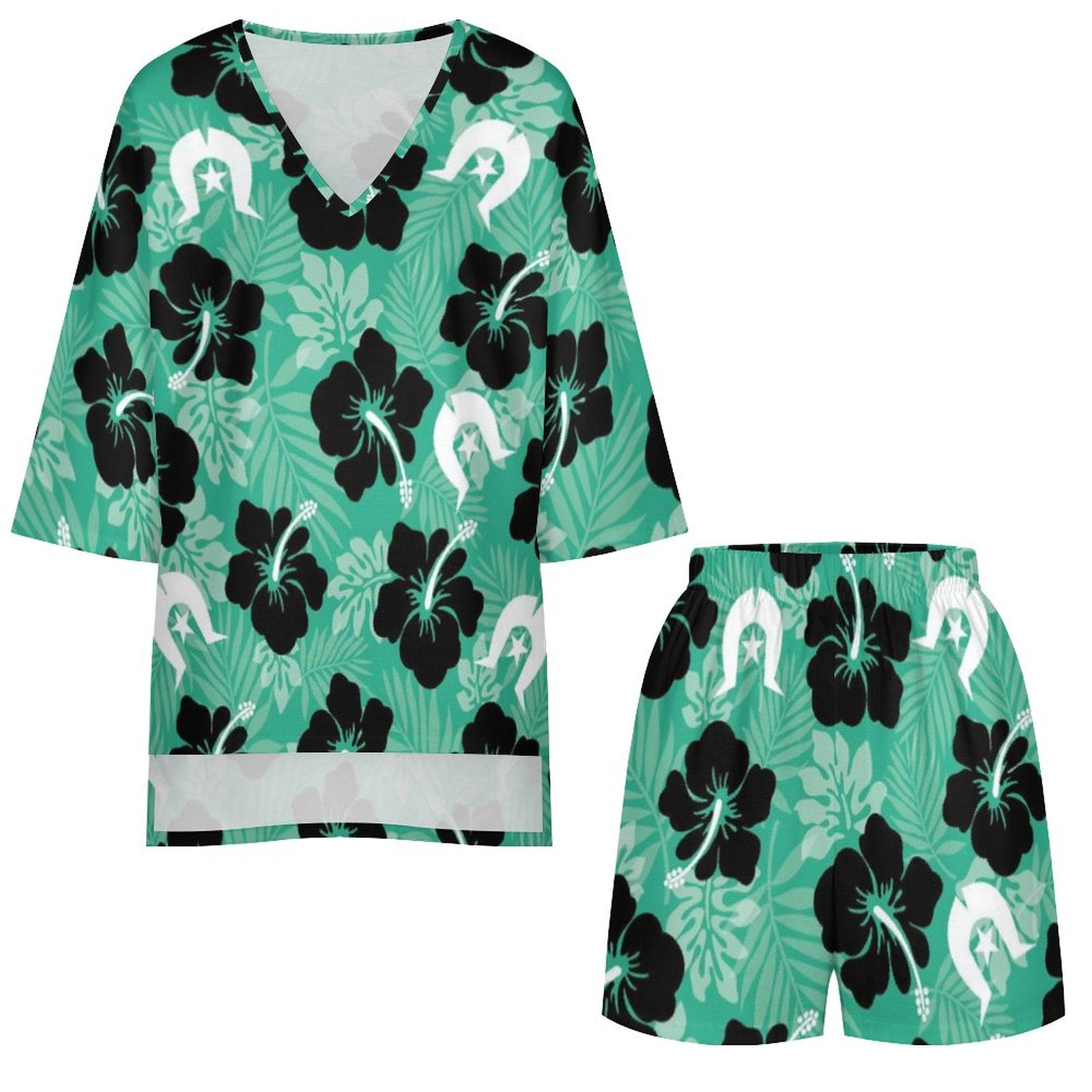 Black Hibiscus with White Dhari on Mediterranean Style V-Neck Suit