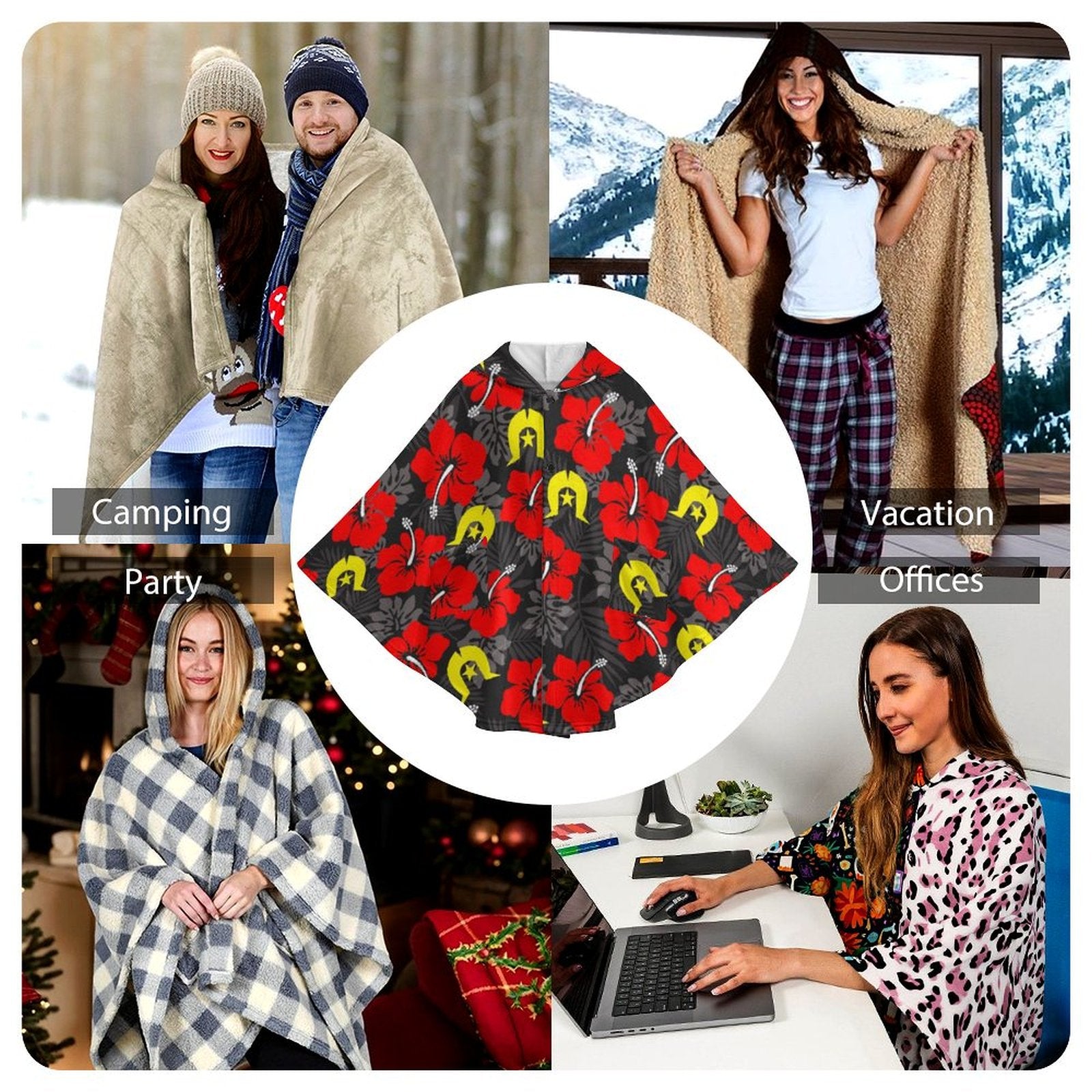 Royal Red Hibiscus with Yellow Dhari on Fleece Hooded Cape for Adults