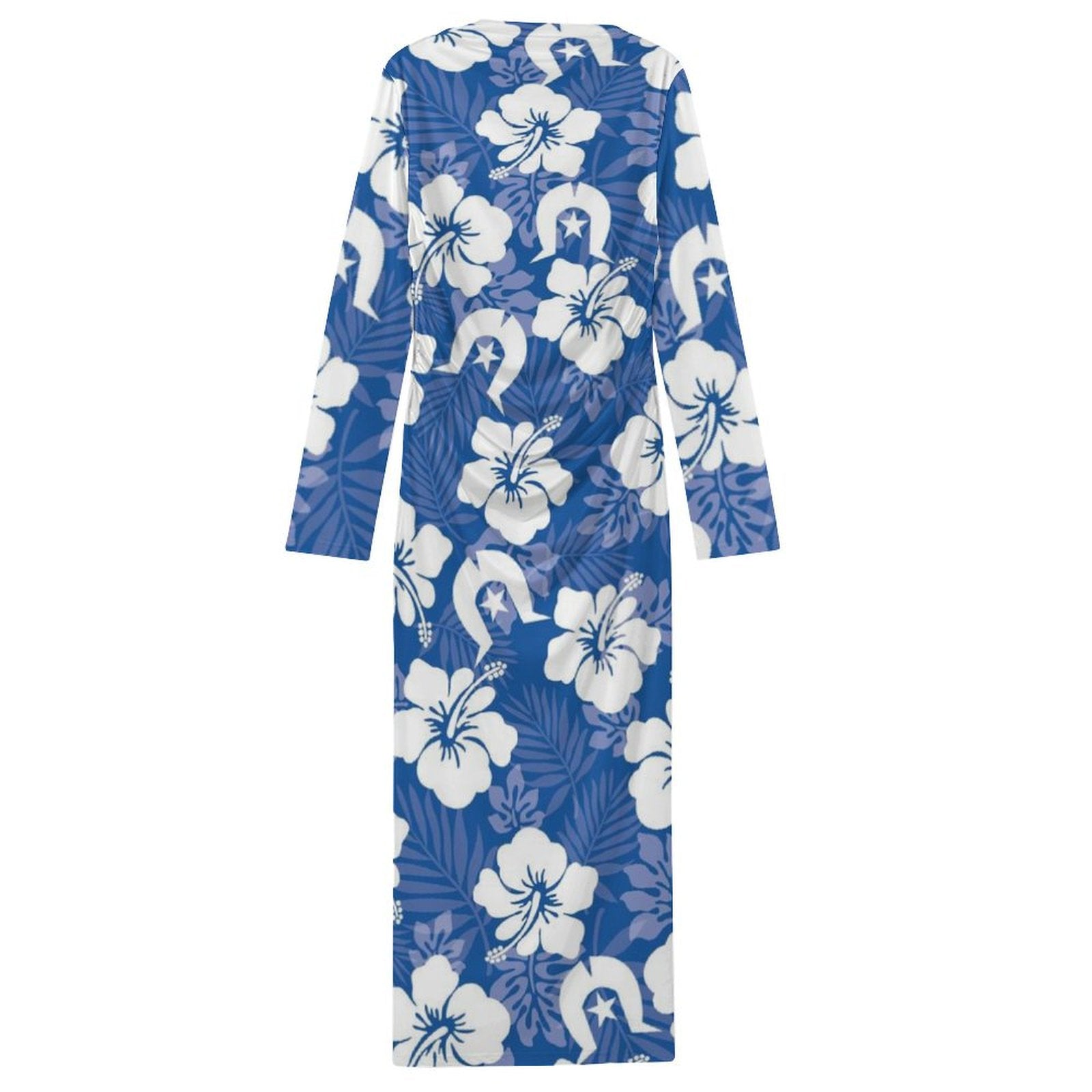 White Hibiscus and Dhari (Blue) on Long-Sleeve Draped Bodycon Dress