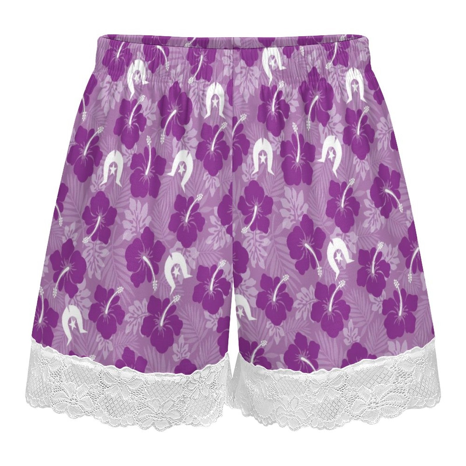 Hibiscus flowers with Dhari (Royal purple) on 200gsm Women's Lace Trim Pajama Shorts