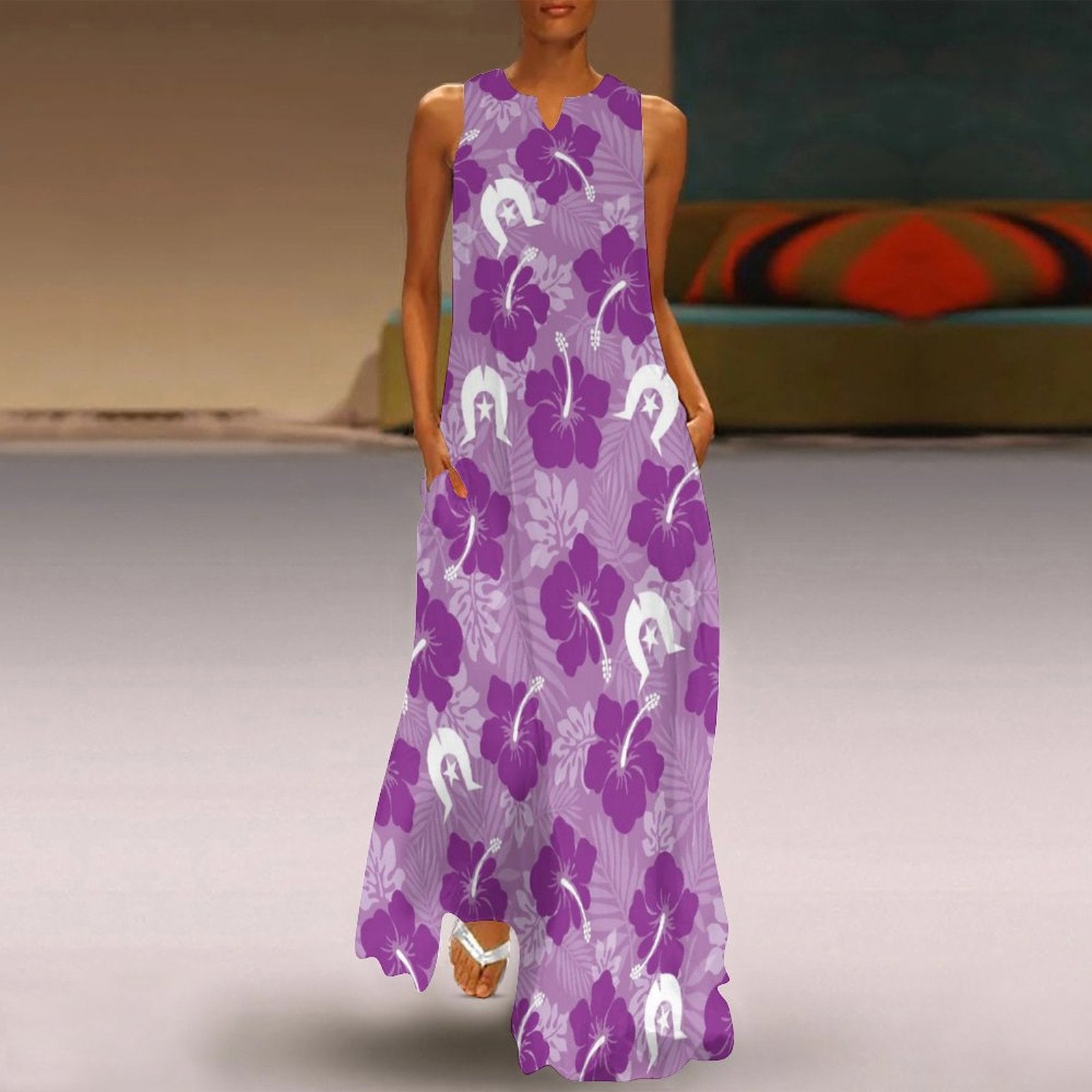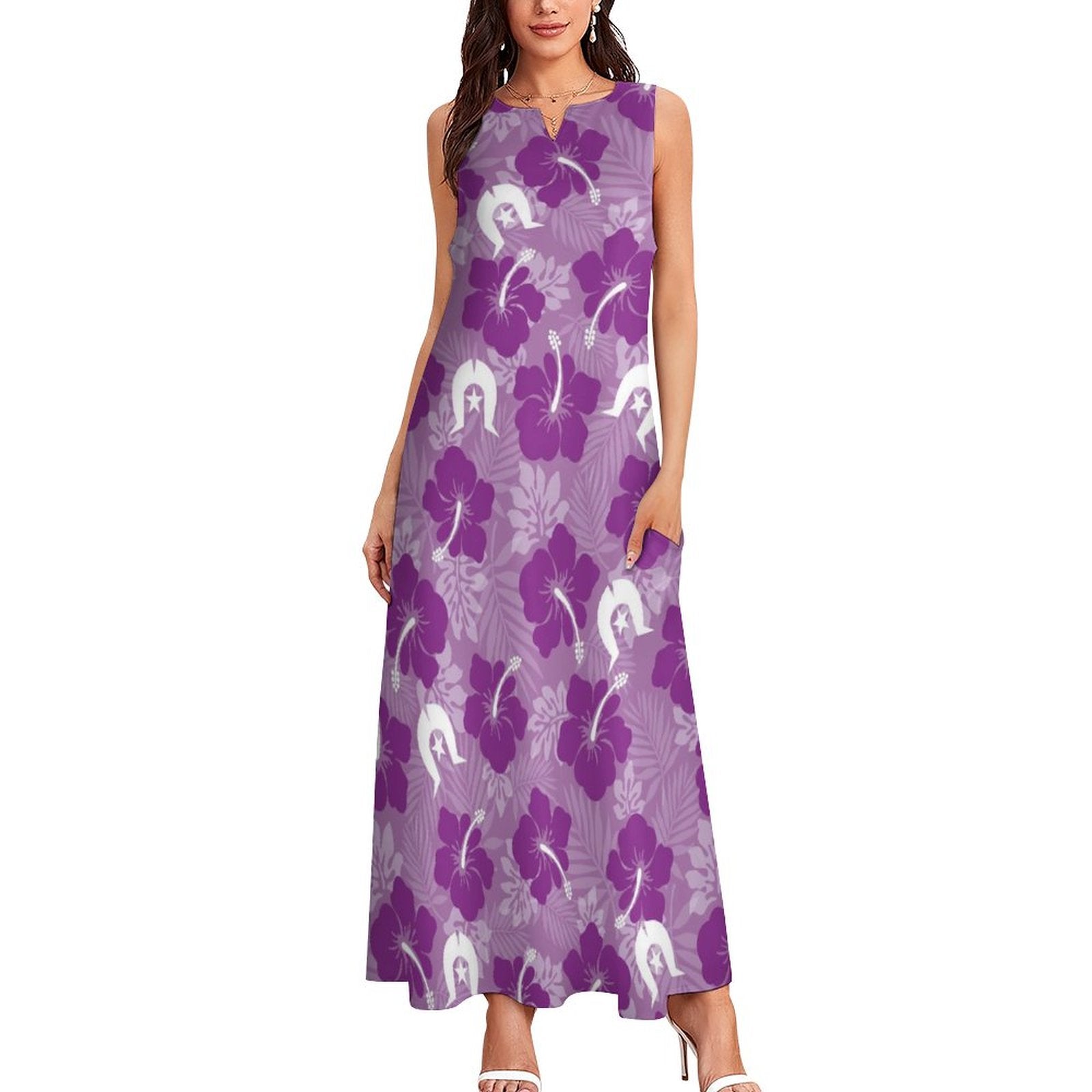 Hibiscus flowers with Dhari (Royal purple) on Sleeveless Ankle-length Dress