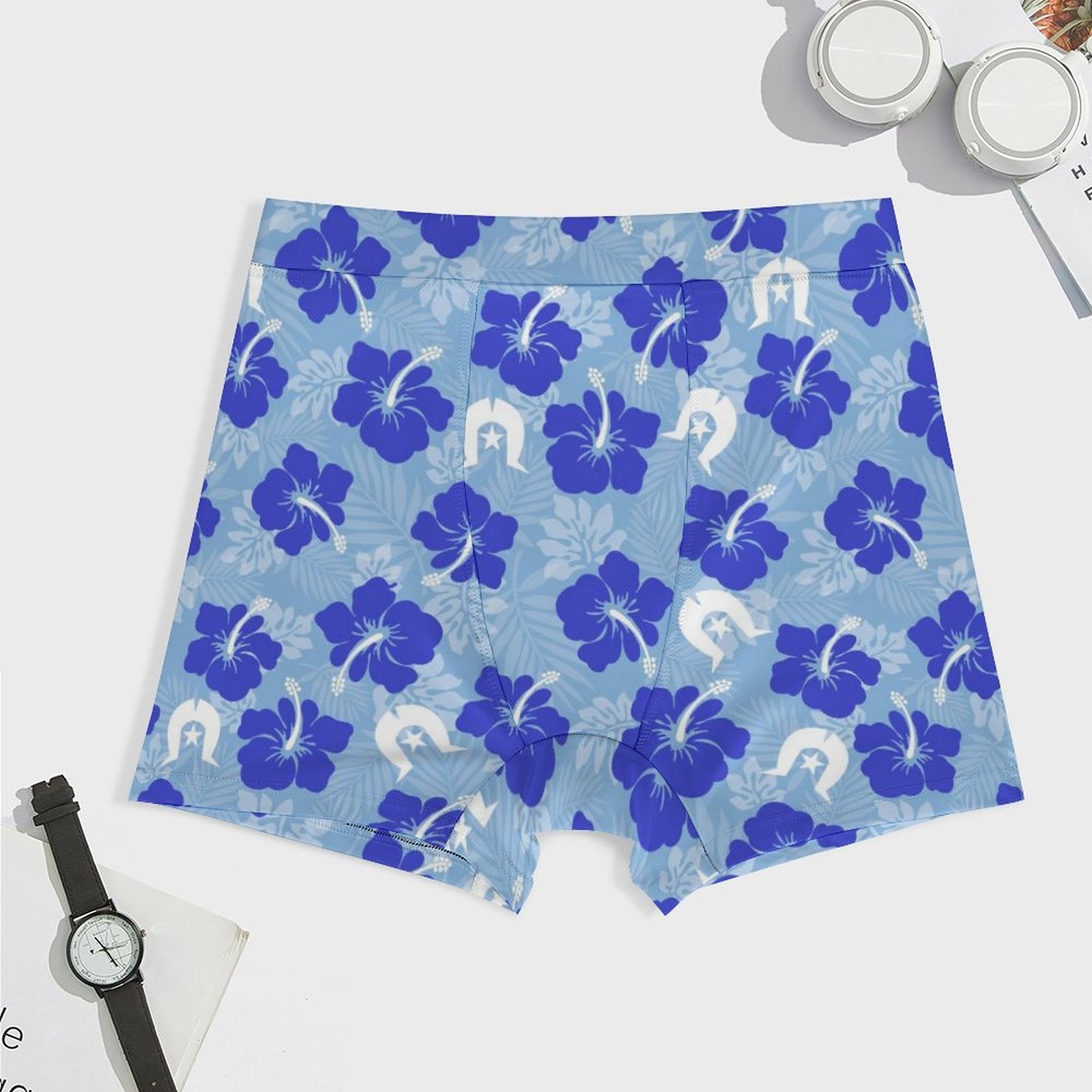 Hibiscus flowers with White Dhari (Sky blue) on Milk Fiber Boxer Shorts for Men