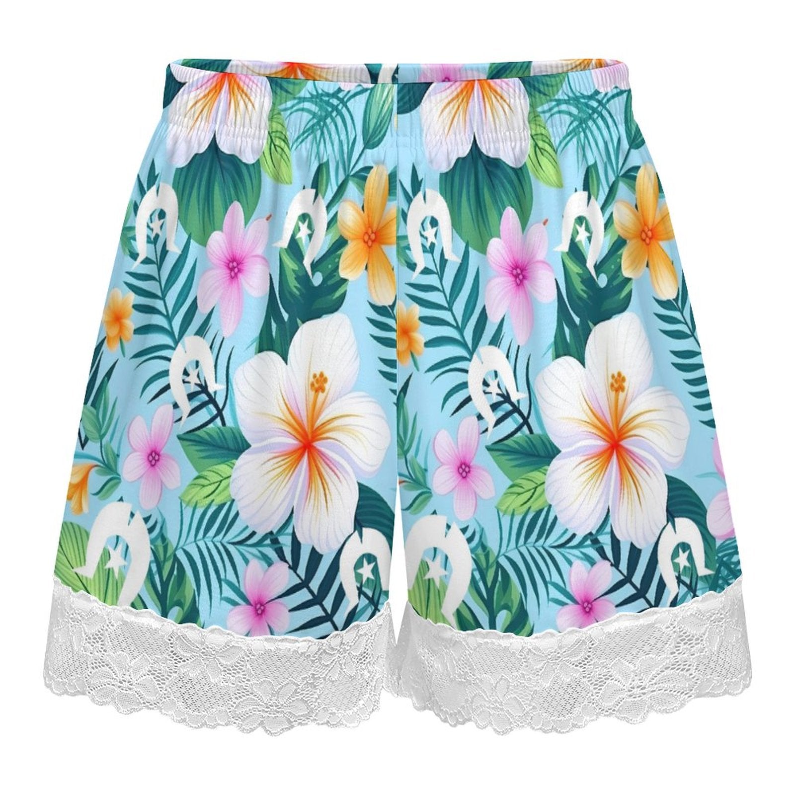 Pink Hibiscus flowers with White Dhari on 200gsm Women's Lace Trim Pajama Shorts