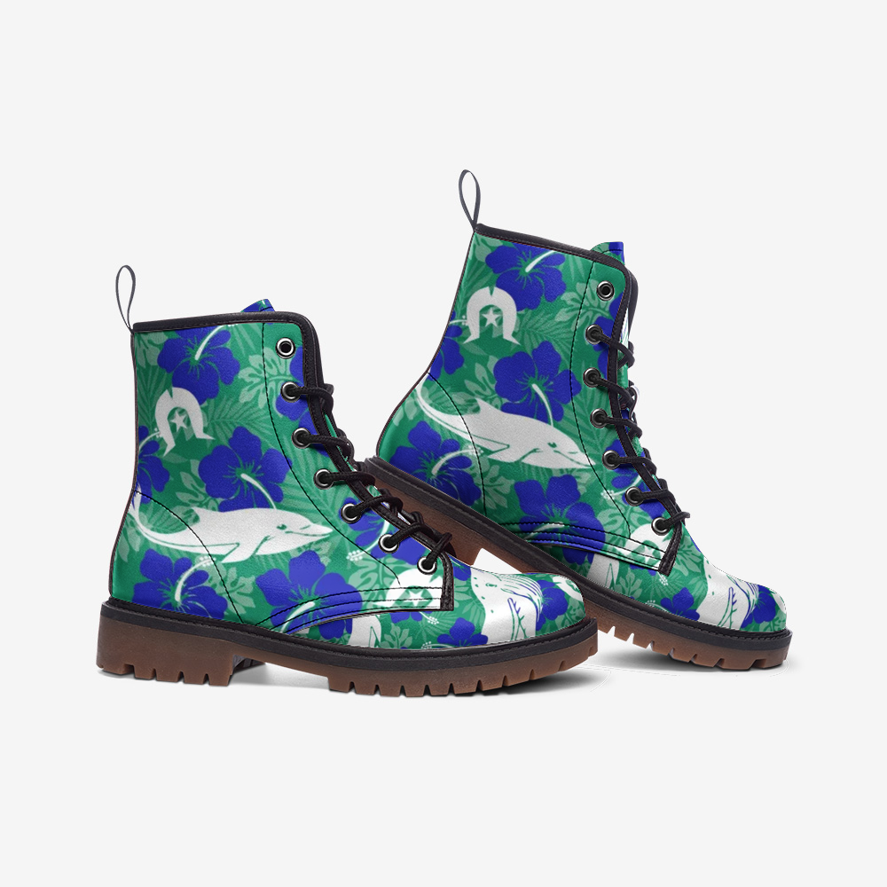 Royal Blue Hibiscus flowers with Whale, Dolphin and Dhari on Casual Leather Lightweight boots MT