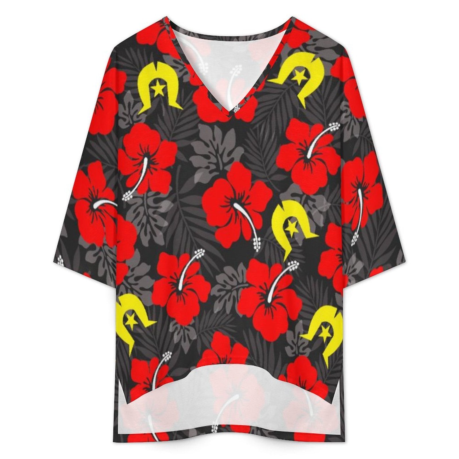 Royal Red Hibiscus with Yellow Dhari on Mediterranean Style V-Neck Suit