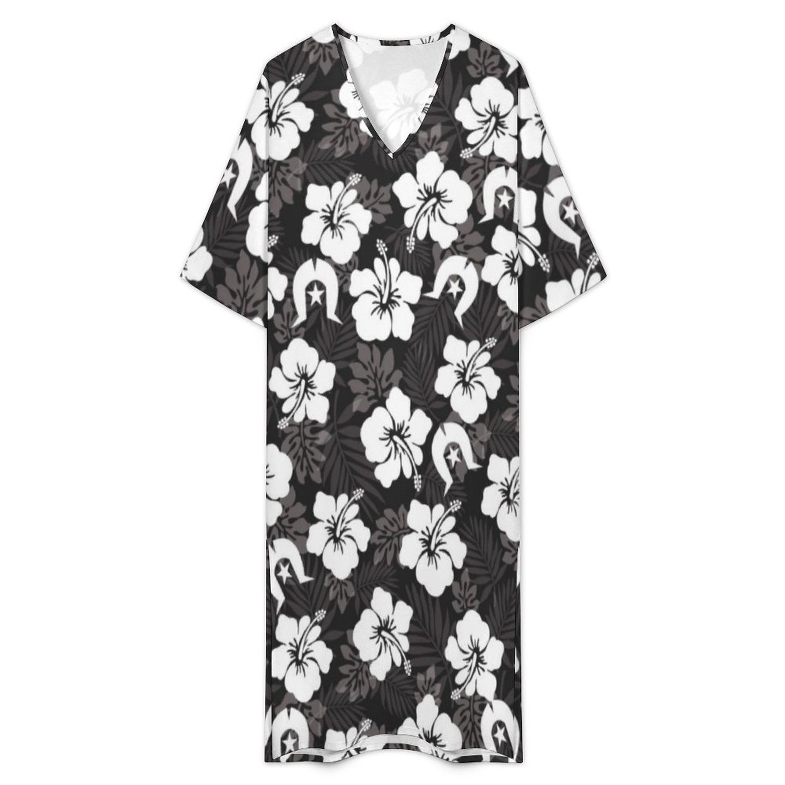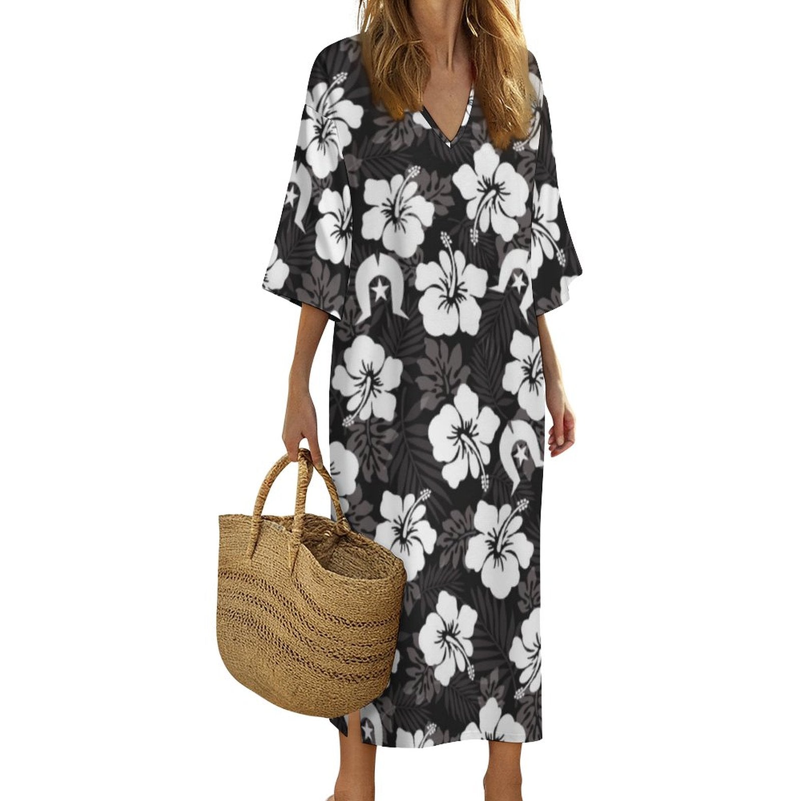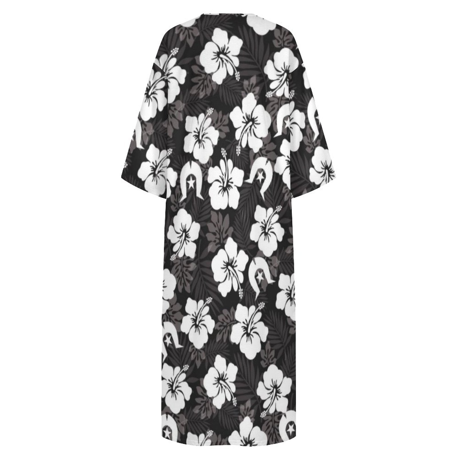 White Hibiscus and Dhari (Black) on Mediterranean Style V Neck Mid-Sleeve Robe