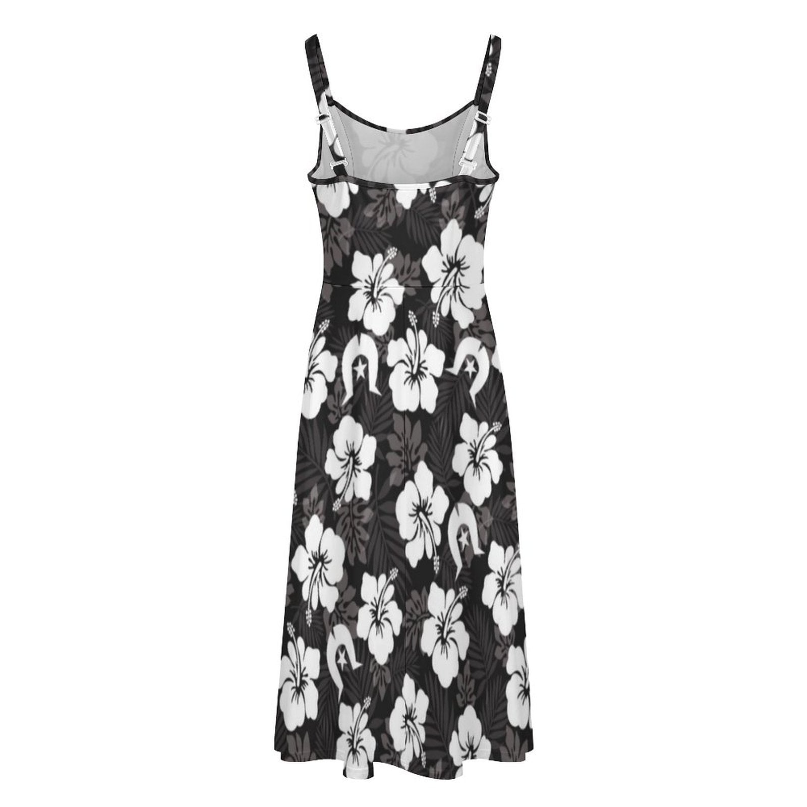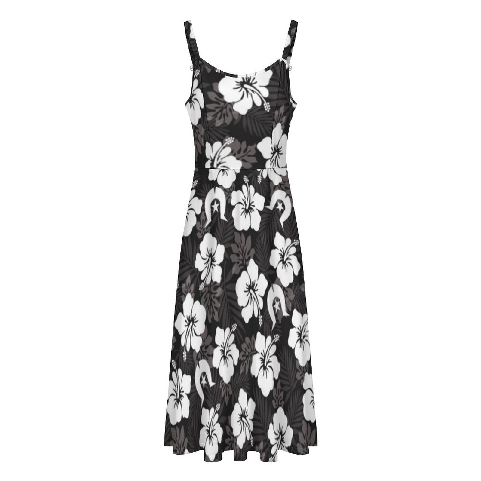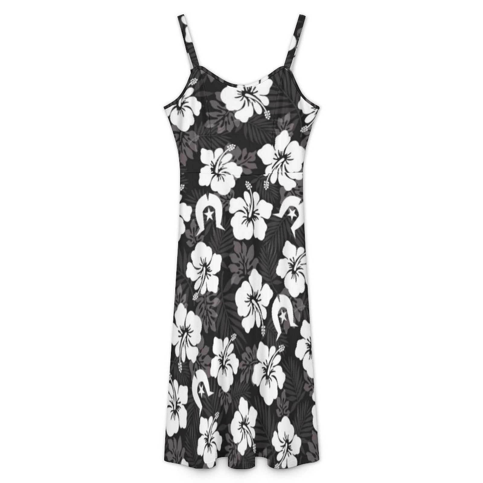 White Hibiscus and Dhari (Black) on Midi Spaghetti Strap Dress
